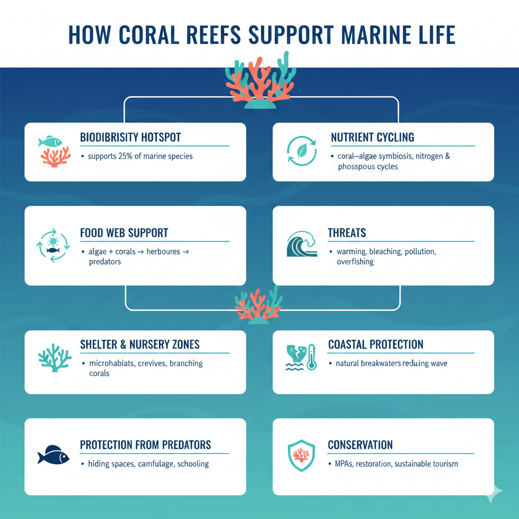 How do coral reefs support marine life?